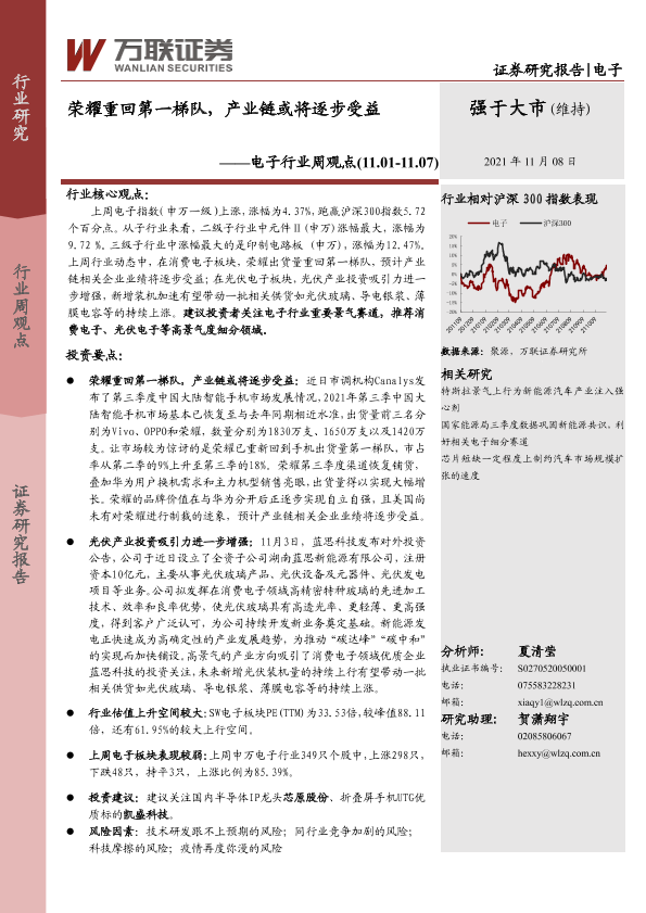 【万联证券】【20211108】20211108-万联证券-电子行业周观点:荣耀重回第一梯队,产业链或将逐步受益-13页