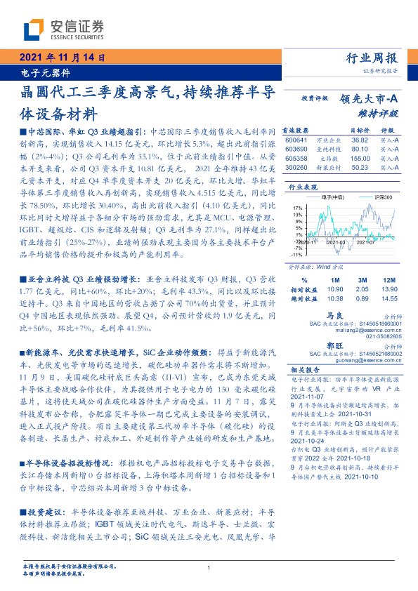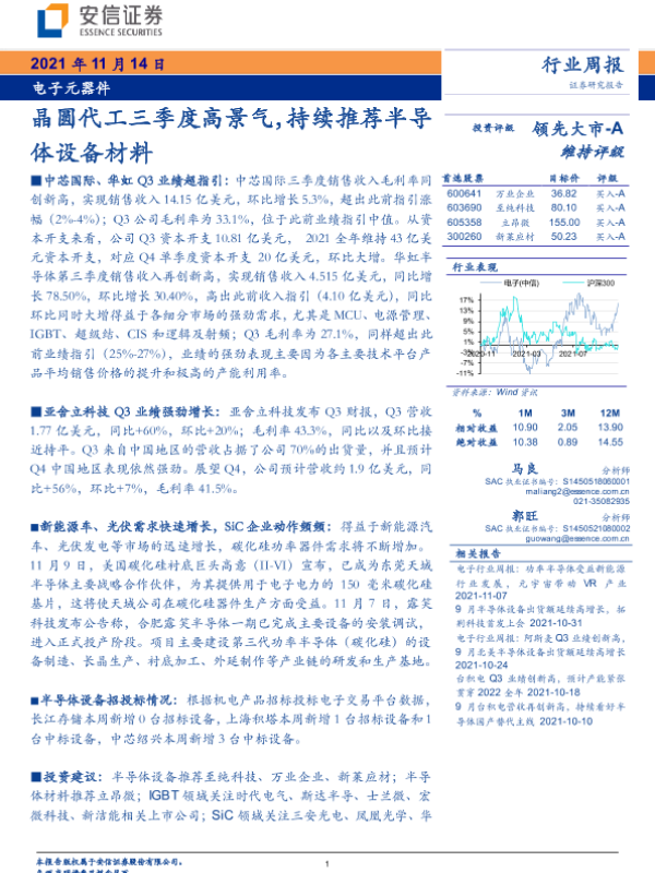 【安信证券】【20211114】电子元器件行业周报:晶圆代工三季度高景气,持续推荐半导体设备材料-15页
