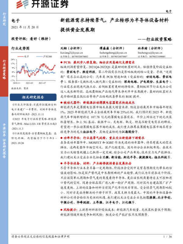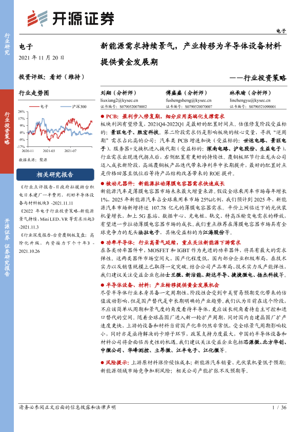 【开源证券】【20211120】20211120-开源证券-电子行业投资策略:新能源需求持续景气,产业转移为半导体设备材料提供黄金发展期-36页