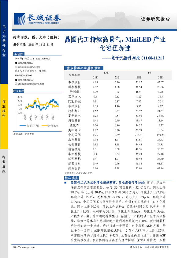 【长城证券】【20211121】电子元器件周报:晶圆代工持续高景气,MiniLED产业化进程加速-20页