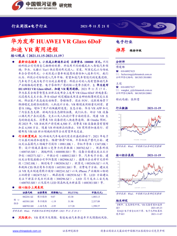 【银河证券】【20211121】电子行业周报:华为发布HUAWEI VR Glass 6DoF,加速VR商用进程-25页