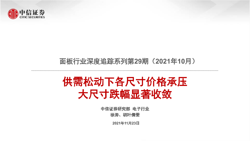 【中信证券】【20211123】面板行业深度追踪系列第29期(2021年10月):供需松动下各尺寸价格承压,大尺寸跌幅显著收敛-22页