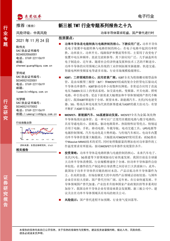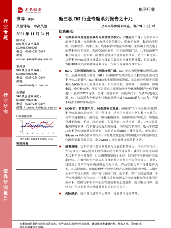 【东莞证券】【20211124】电子行业新三板TMT行业专题系列报告之十九:功率半导体需求旺盛,国产替代进行时-18页