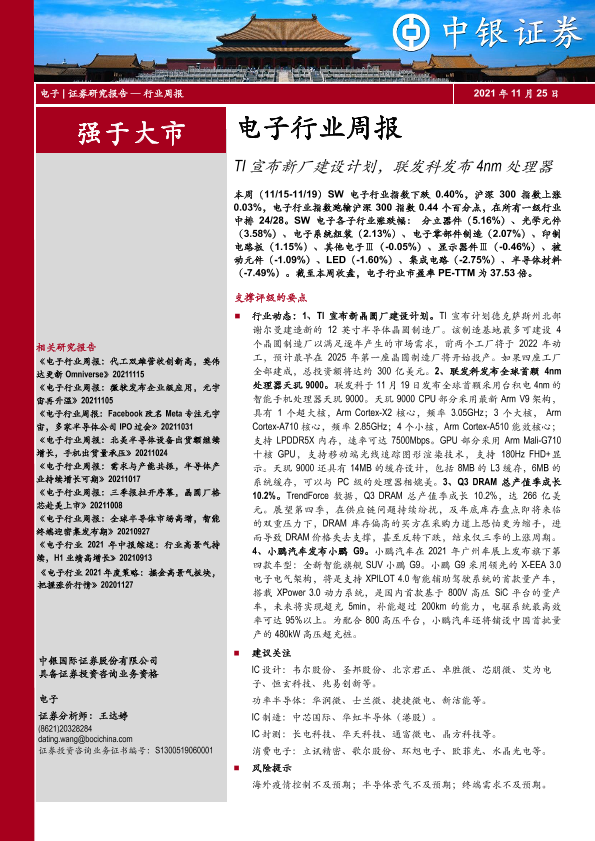 【中银证券】【20211125】电子行业周报:TI宣布新厂建设计划,联发科发布4nm处理器-12页