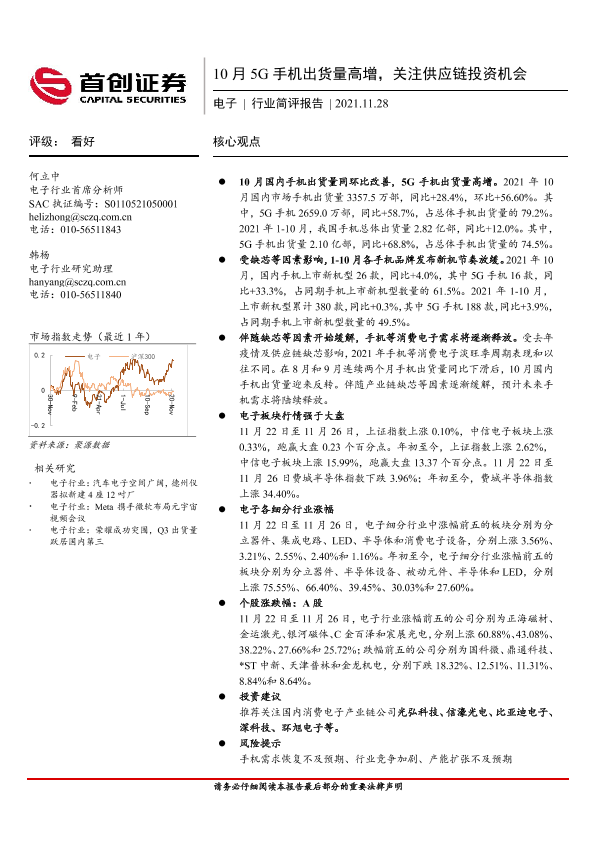 【首创证券】【20211128】20211128-首创证券-电子行业简评报告 :10月5G手机出货量高增,关注供应链投资机会-10页