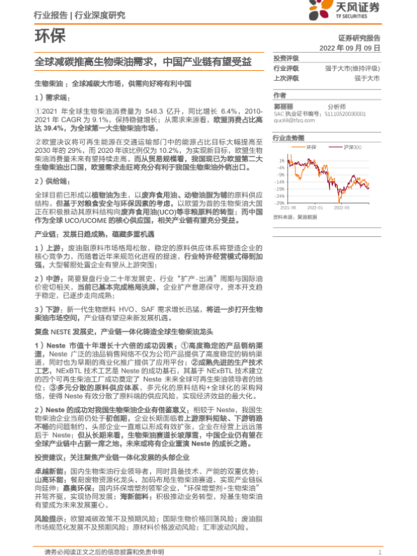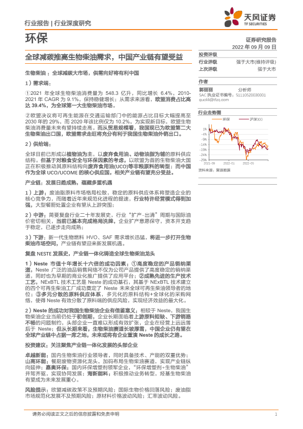 【天风证券】【20220909】环保行业深度研究:全球减碳推高生物柴油需求,中国产业链有望受益-41页