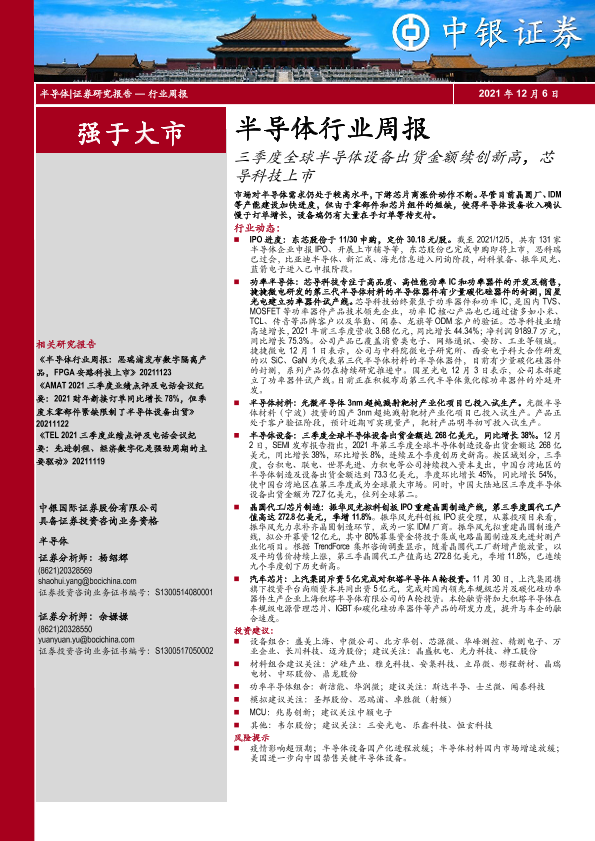 【中银证券】【20211206】20211206-中银证券-半导体行业周报:三季度全球半导体设备出货金额续创新高,芯导科技上市-19页