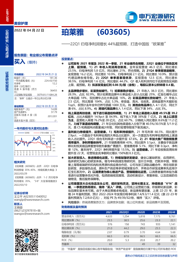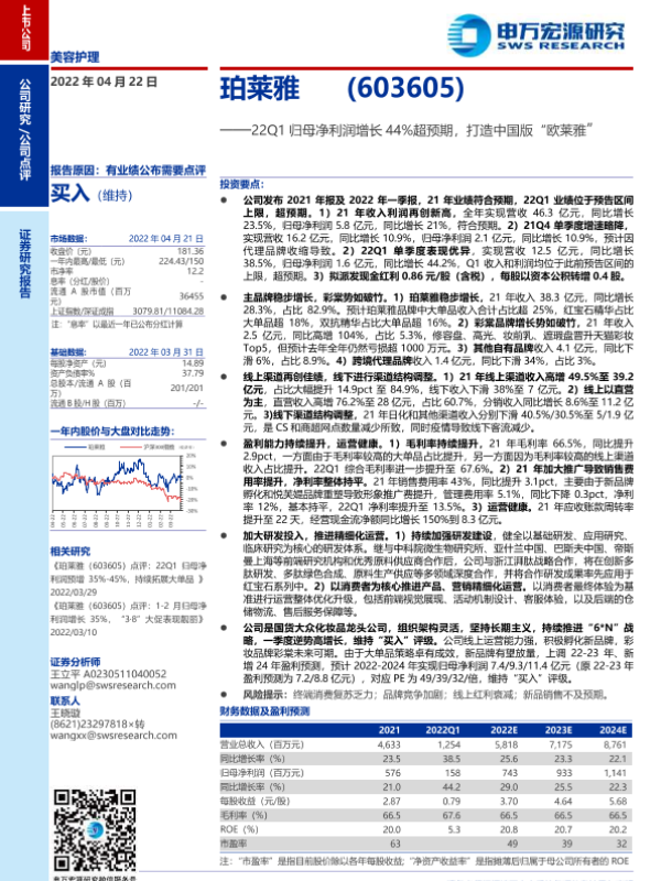 【申万宏源】【20220422】珀莱雅-603605-22Q1归母净利润增长44%超预期,打造中国版“欧莱雅”-4页