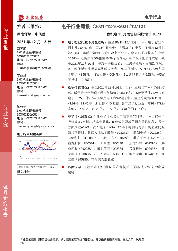 【东莞证券】【20211213】电子行业周报:台积电11月销售额同比增长18.7%-12页