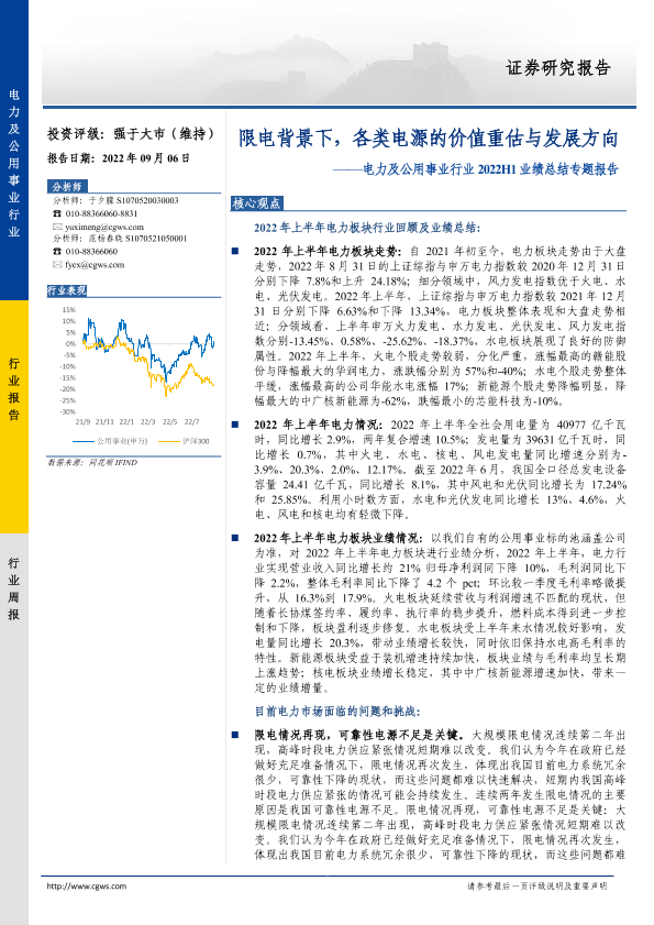 【长城证券】【20220906】电力及公用事业行业2022H1业绩总结专题报告:限电背景下,各类电源的价值重估与发展方向-53页