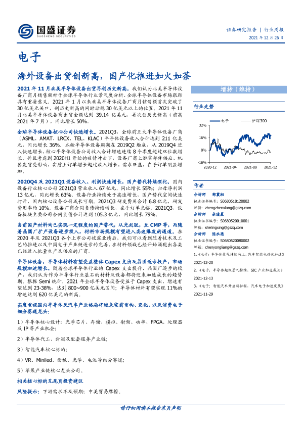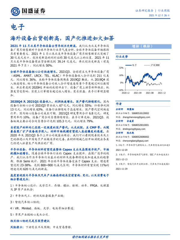 【国盛证券】【20211226】电子行业周报:海外设备出货创新高,国产化推进如火如荼-24页