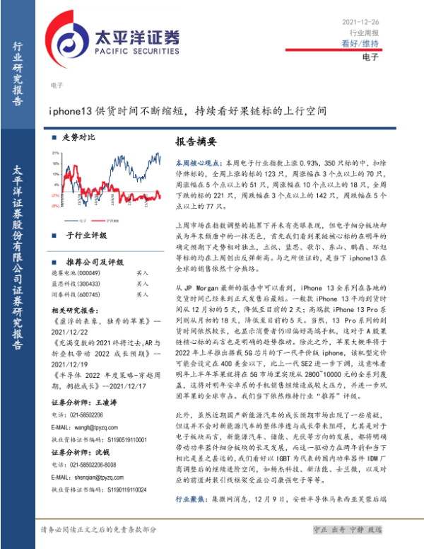 【太平洋证券】【20211226】电子行业周报:iphone13供货时间不断缩短,持续看好果链标的上行空间-15页