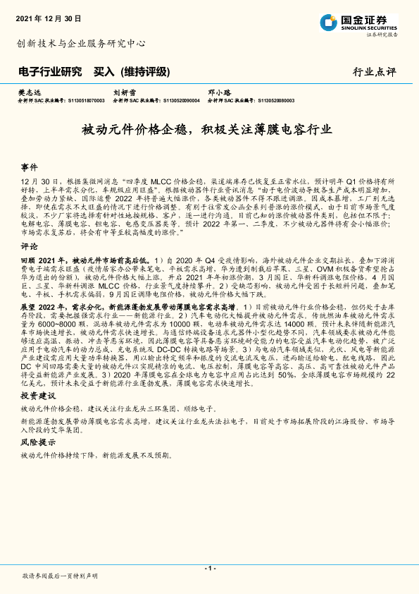 【国金证券】【20211230】20211230-国金证券-电子行业点评:被动元件价格企稳,积极关注薄膜电容行业-3页