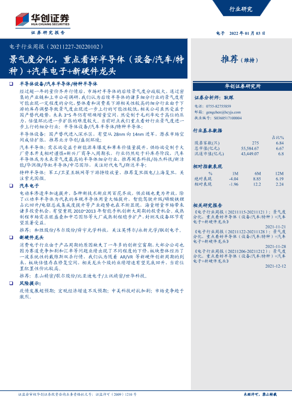 【华创证券】【20220103】电子行业周报:景气度分化,重点看好半导体(设备 汽车 特种)+汽车电子+新硬件龙头-20页