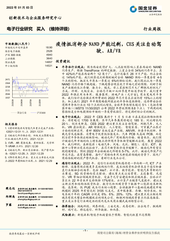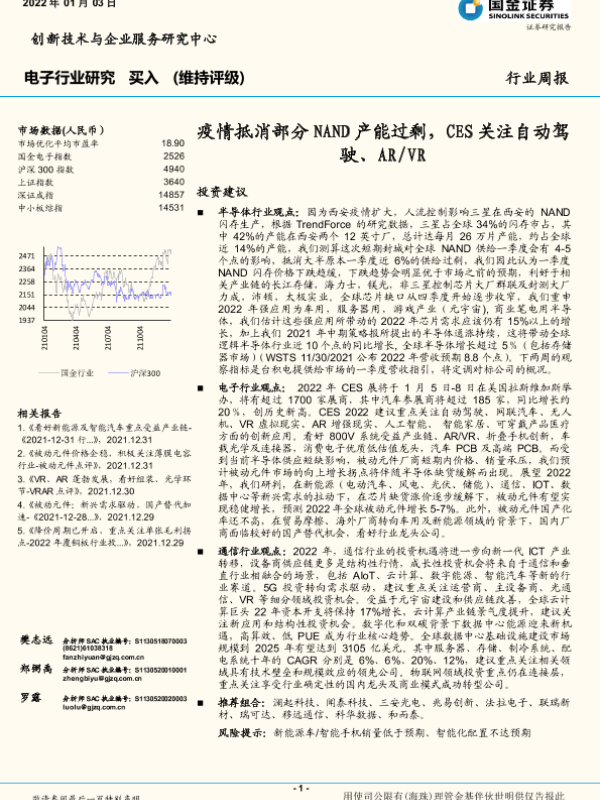 【国金证券】【20220103】电子行业研究:疫情抵消部分NAND产能过剩,CES关注自动驾驶、AR VR-19页