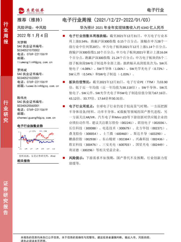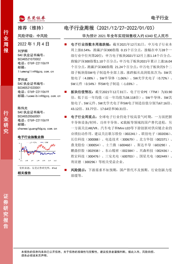 【东莞证券】【20220104】电子行业周报:华为预计2021年全年实现销售收入约6340亿人民币-13页