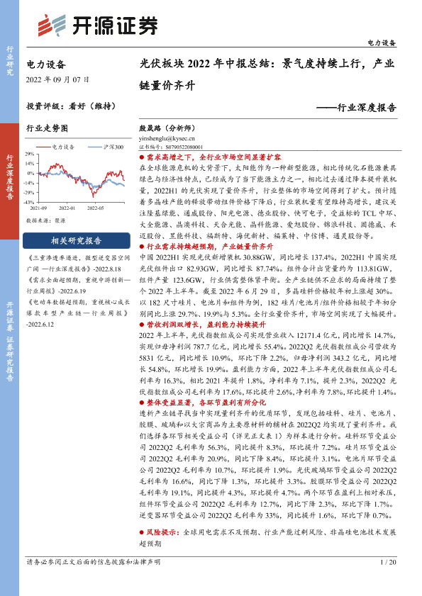 【开源证券】【20220907】电力设备行业深度报告:光伏板块2022年中报总结,景气度持续上行,产业链量价齐升-20页