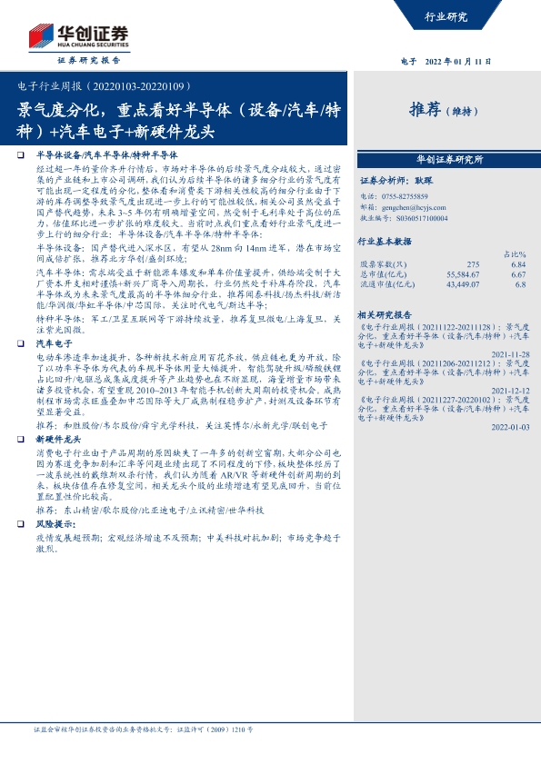 【华创证券】【20220111】20220111-华创证券-电子行业周报:景气度分化,重点看好半导体(设备 汽车 特种)+汽车电子+新硬件龙头-19页