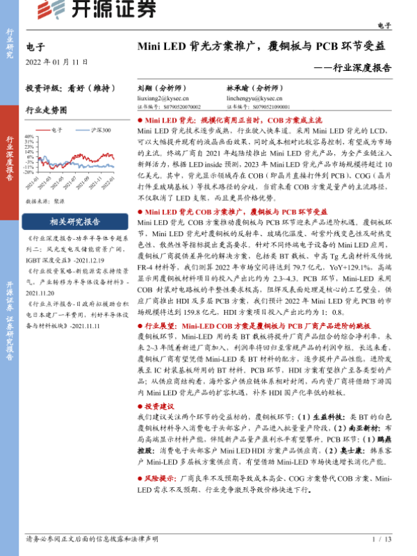 【开源证券】【20220111】20220111-开源证券-电子行业深度报告:Mini LED背光方案推广,覆铜板与PCB环节受益-13页