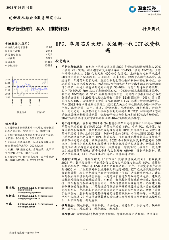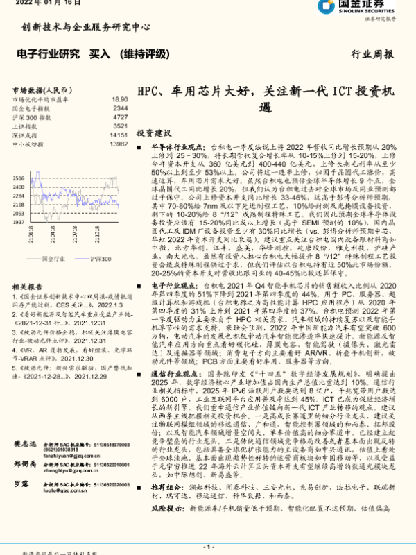 【国金证券】【20220116】20220116-国金证券-电子行业研究周报:HPC、车用芯片大好,关注新一代ICT投资机遇-20页