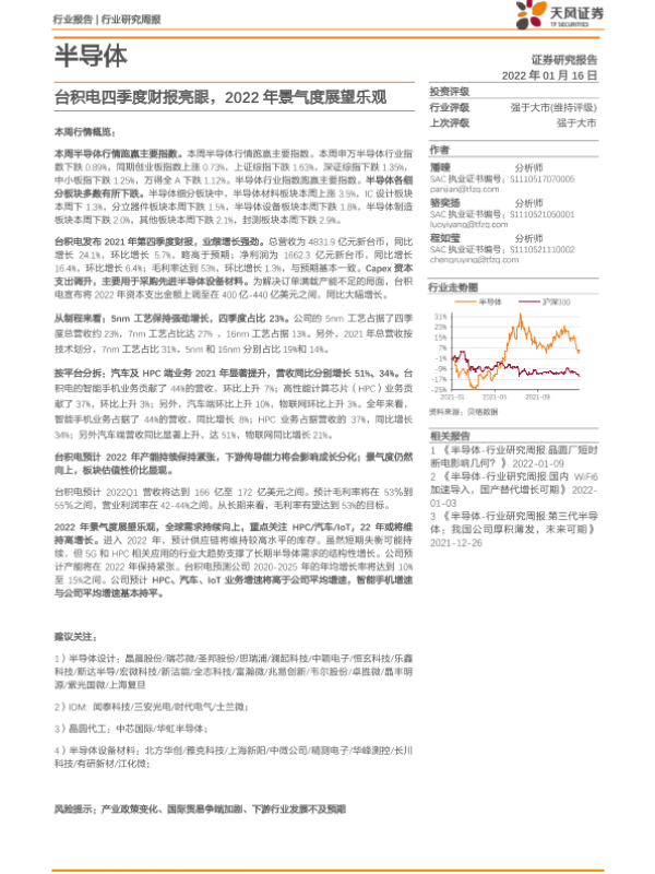 【天风证券】【20220116】20220116-天风证券-半导体行业研究周报:台积电四季度财报亮眼,2022年景气度展望乐观-11页