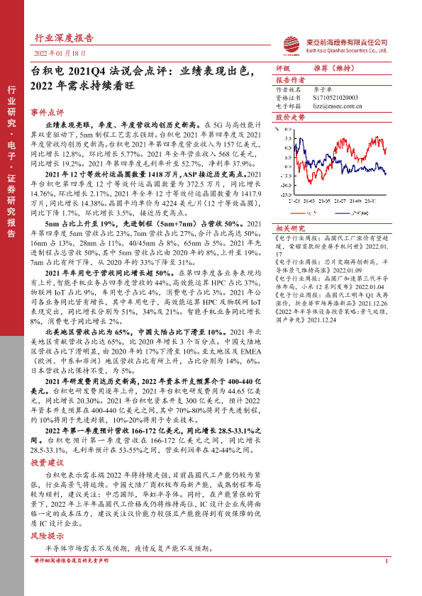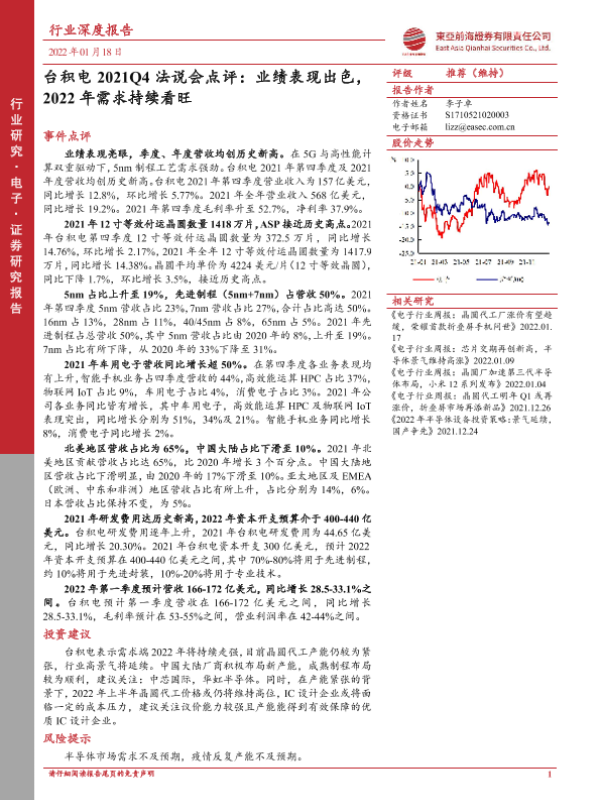 【东亚前海证券】【20220118】台积电2021Q4法说会点评:业绩表现出色,2022年需求持续看旺-12页