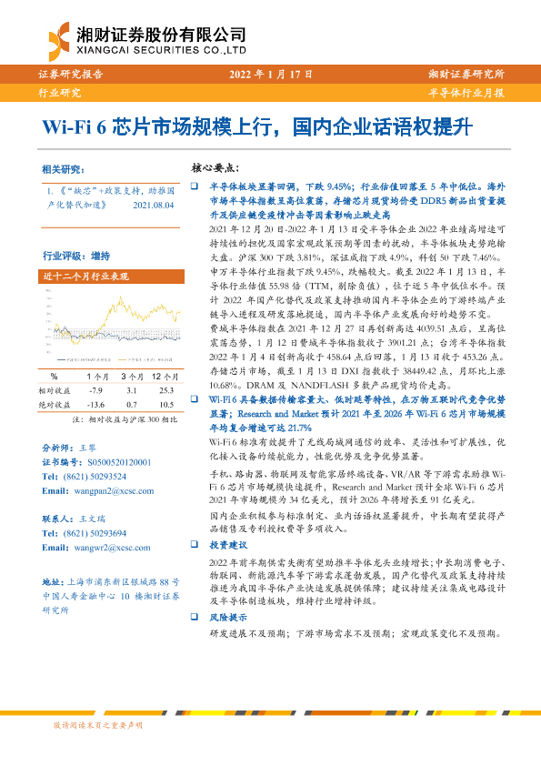 【湘财证券】【20220117】半导体行业月报:Wi-Fi6芯片市场规模上行,国内企业话语权提升-11页