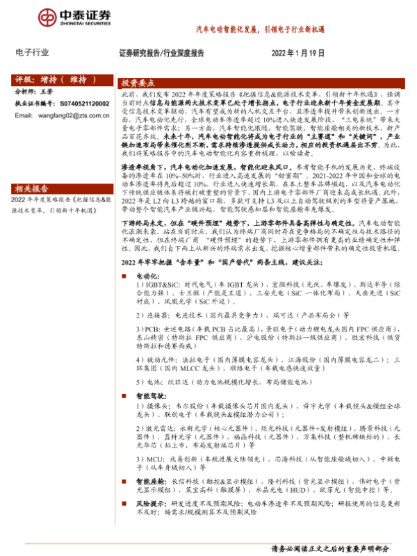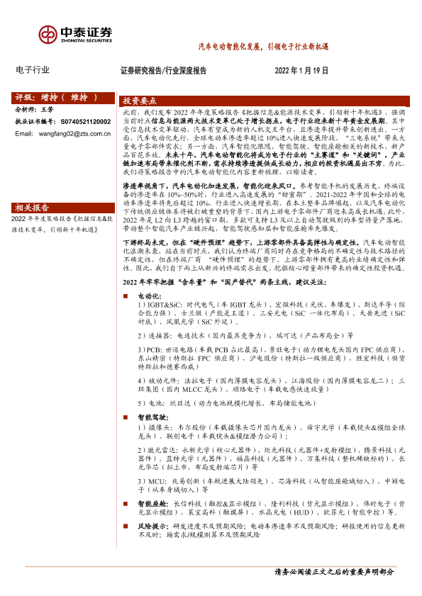 【中泰证券】【20220119】汽车电动智能化发展,引领电子行业新机遇-29页