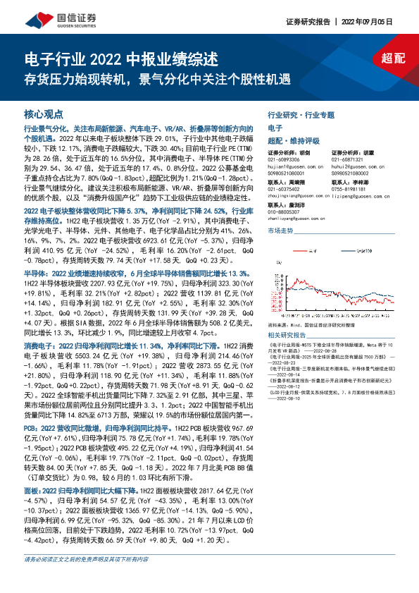 【国信证券】【20220905】电子行业2022中报业绩综述:存货压力始现转机,景气分化中关注个股性机遇-26页