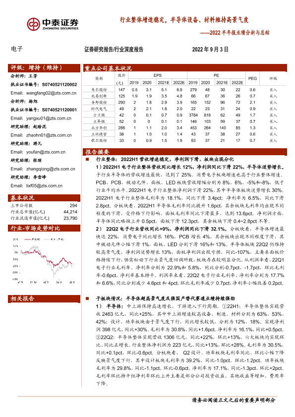 【中泰证券】【20220903】电子行业2022半年报业绩分析与总结:行业整体增速稳定,半导体设备、材料维持高景气度-55页