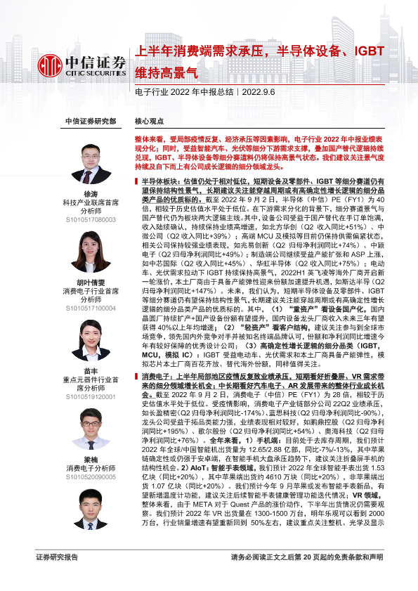 【中信证券】【20220906】电子行业2022年中报总结:上半年消费端需求承压,半导体设备、IGBT维持高景气-21页