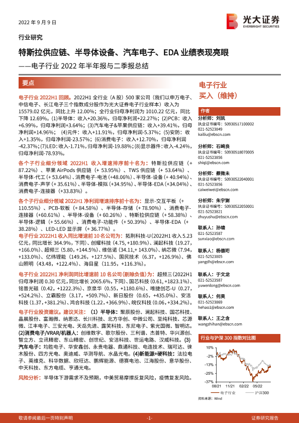 【光大证券】【20220909】电子行业2022年半年报与二季报总结:特斯拉供应链、半导体设备、汽车电子、EDA业绩表现亮眼-40页