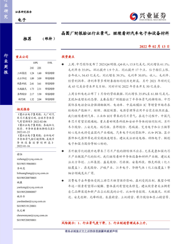 【兴业证券】【20220213】20220213-兴业证券-电子行业周报:晶圆厂财报验证行业景气,继续看好汽车电子和设备材料-9页