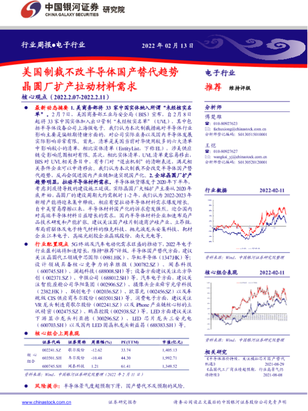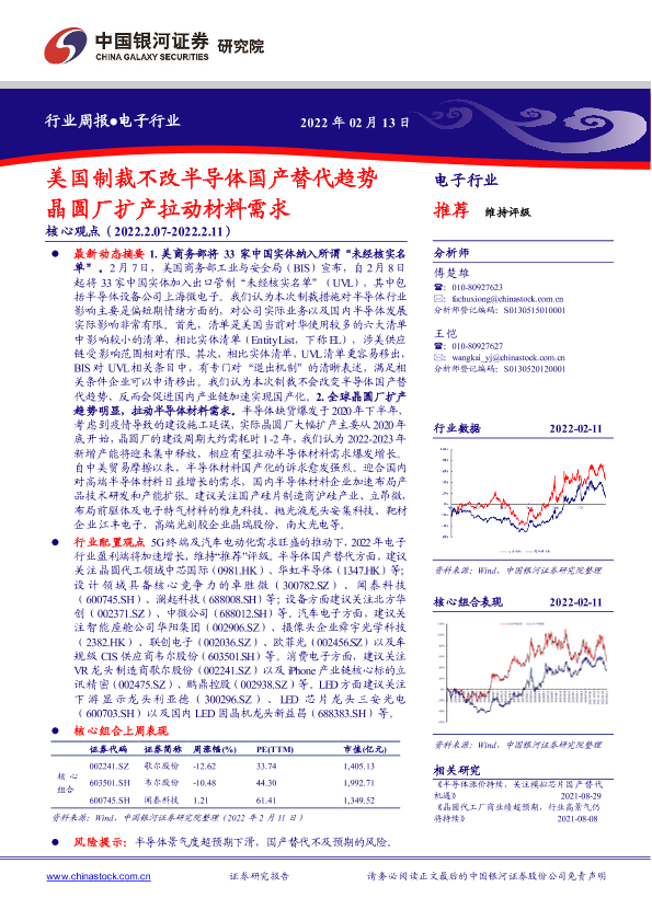 【银河证券】【20220213】电子行业周报:美国制裁不改半导体国产替代趋势 晶圆厂扩产拉动材料需求-26页