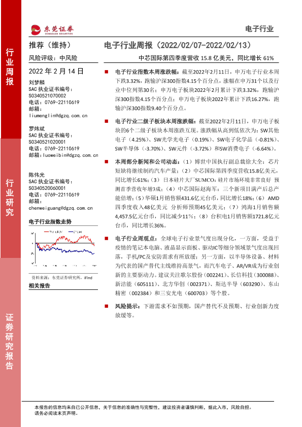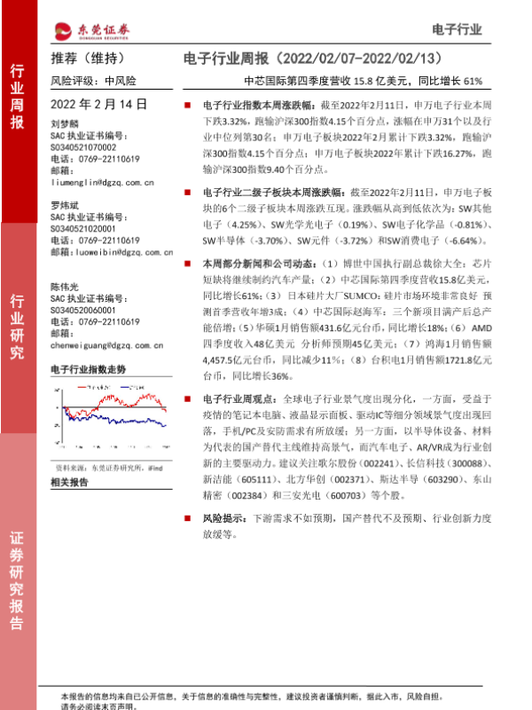 【东莞证券】【20220214】电子行业周报:中芯国际第四季度营收15.8亿美元,同比增长61%-11页