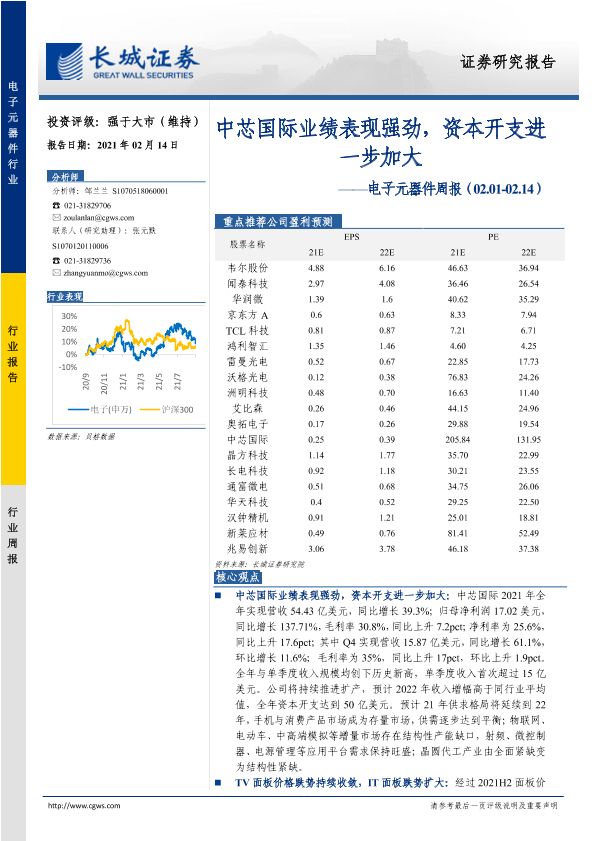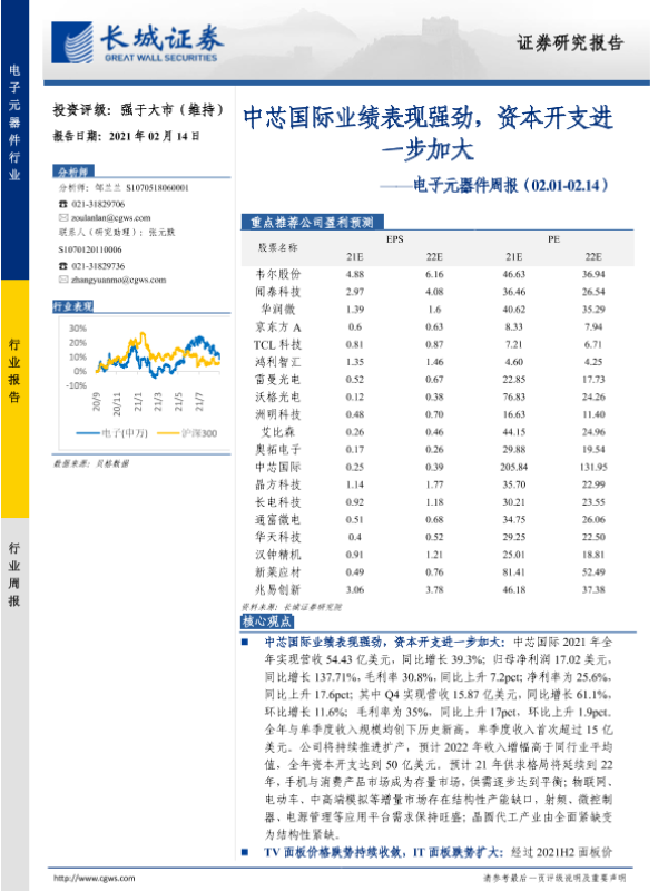 【长城证券】【20220214】20220214-长城证券-电子元器件周报:中芯国际业绩表现强劲,资本开支进一步加大-22页