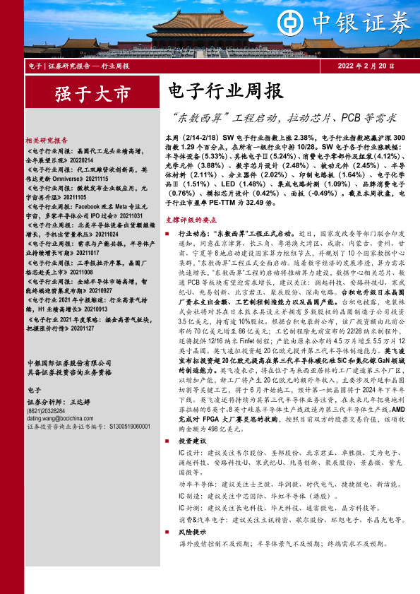 【中银证券】【20220220】电子行业周报:“东数西算”工程启动,拉动芯片、PCB等需求-13页