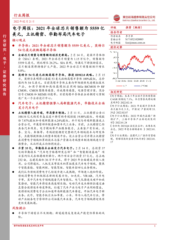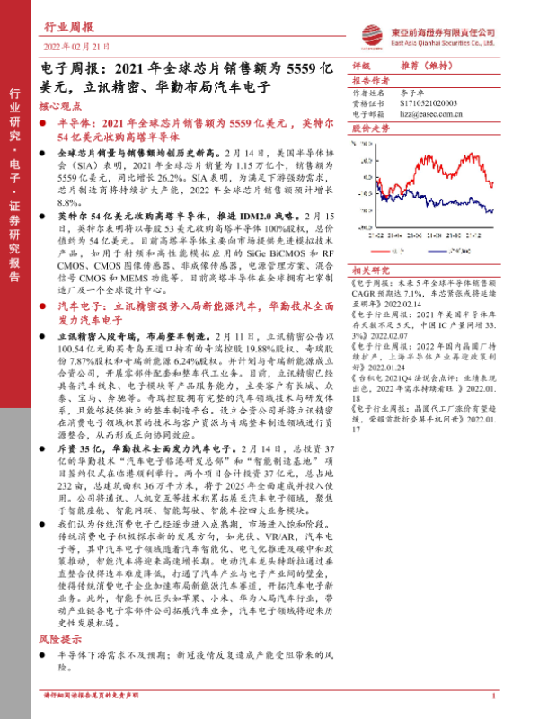 【东亚前海证券】【20220221】电子周报:2021年全球芯片销售额为5559亿美元,立讯精密、华勤布局汽车电子-18页