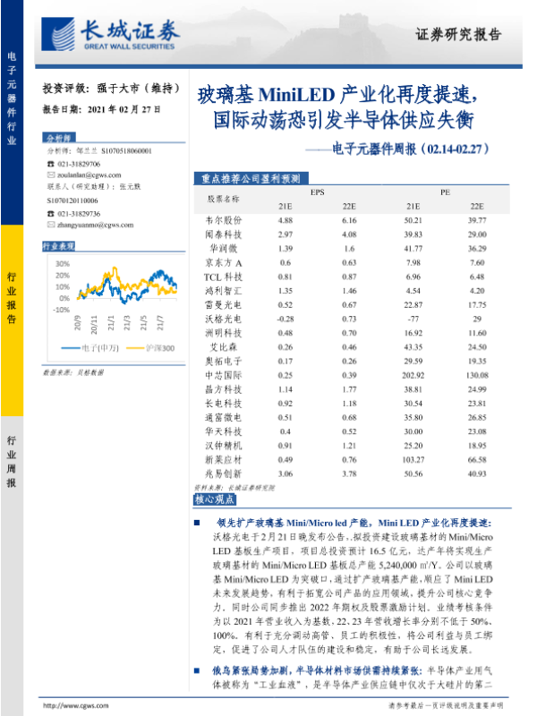 【长城证券】【20220227】电子元器件周报:璃基MiniLED产业化再度提速,国际动荡恐引发半导体供应失衡-22页