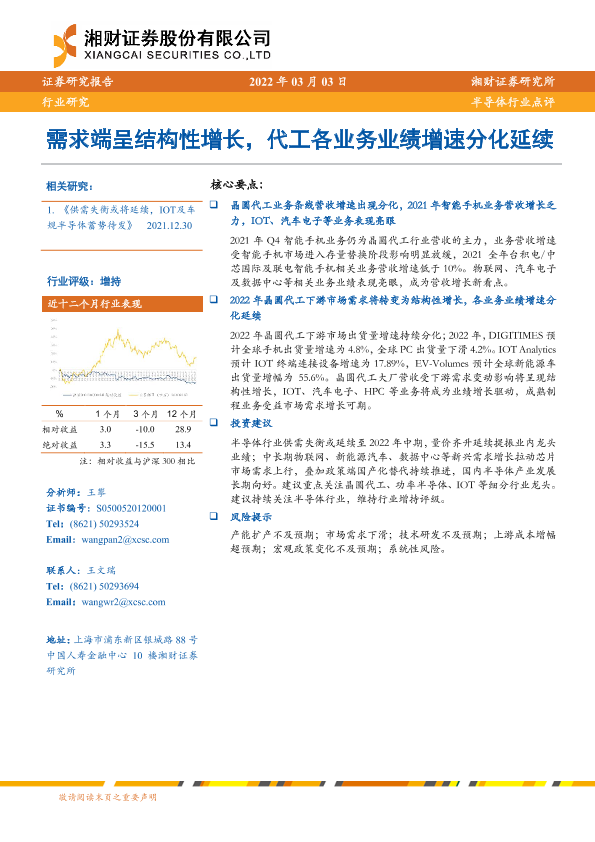 【湘财证券】【20220303】20220303-湘财证券-半导体行业点评:需求端呈结构性增长,代工各业务业绩增速分化延续-7页