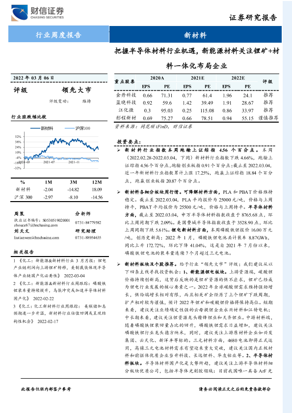 【财信证券】【20220306】20220306-财信证券-新材料行业周度报告:把握半导体材料行业机遇,新能源材料关注锂矿+材料一体化布局企业-20页