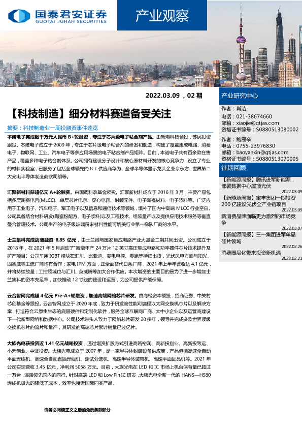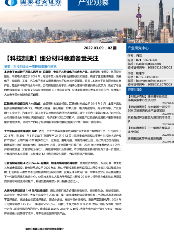【国泰君安证券】【20220309】【科技制造】细分材料赛道备受关注-6页