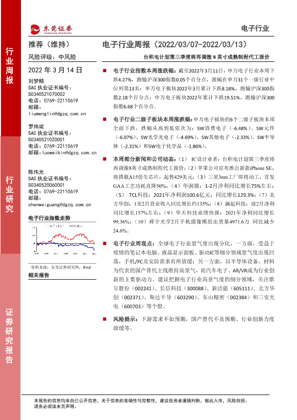 【东莞证券】【20220314】电子行业周报:台积电计划第三季度将再调涨8英寸成熟制程代工报价-11页