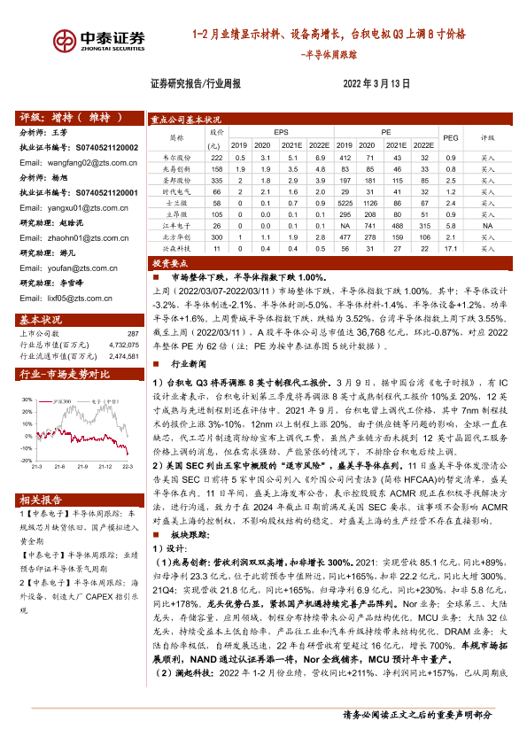 【中泰证券】【20220313】半导体周跟踪:1-2月业绩显示材料、设备高增长,台积电拟Q3上调8寸价格-14页