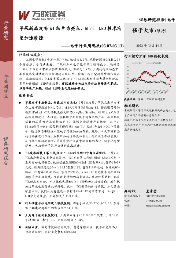 【万联证券】【20220314】20220314-万联证券-电子行业周观点:苹果新品发布AI芯片为亮点,MiniLED技术有望加速渗透-10页