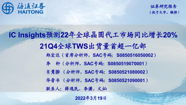 【海通证券】【20220319】IC Insights预测22年全球晶圆代工市场同比增长20% 21Q4全球TWS出货量首超一亿部-10页