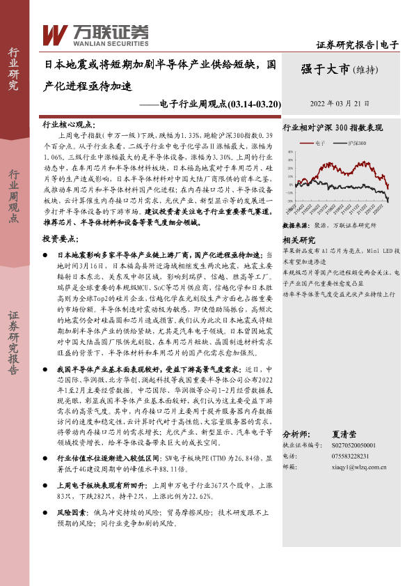 【万联证券】【20220321】20220321-万联证券-电子行业周观点:日本地震或将短期加剧半导体产业供给短缺,国产化进程亟待加速-10页