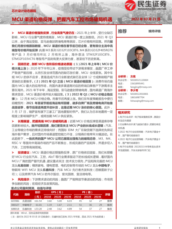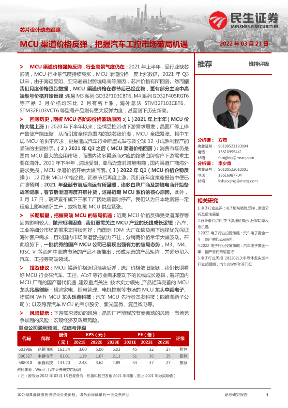 【民生证券】【20220321】芯片设计动态跟踪:MCU渠道价格反弹,把握汽车工控市场破局机遇-11页