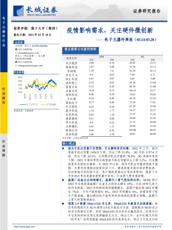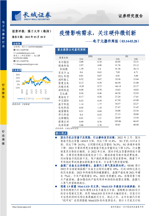 【长城证券】【20220328】20220328-长城证券-电子元器件周报:疫情影响需求,关注硬件微创新-17页