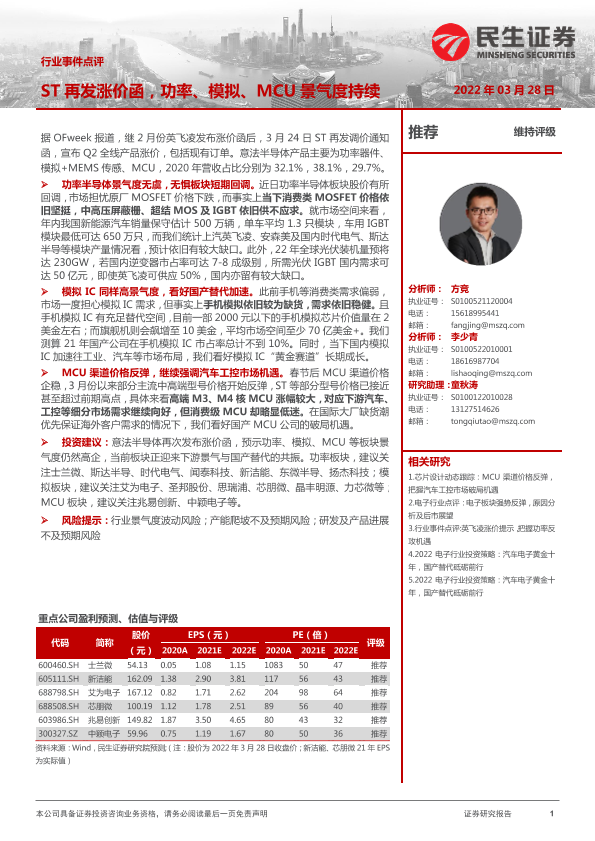 【民生证券】【20220328】20220328-民生证券-电子行业事件点评:ST再发涨价函,功率、模拟、MCU景气度持续-2页
